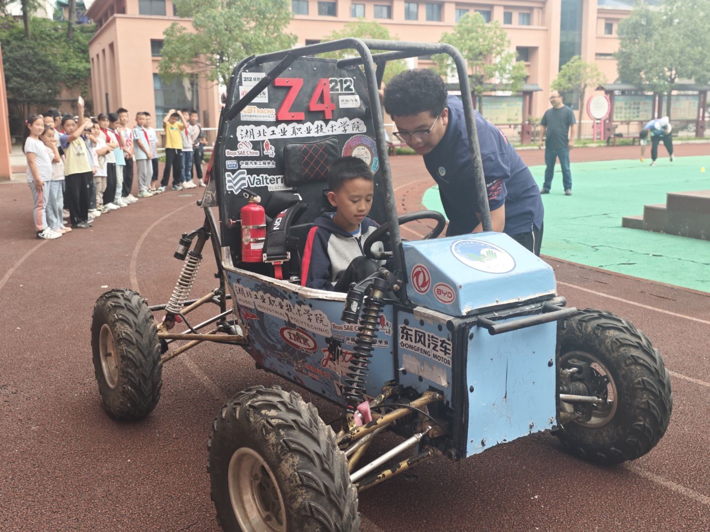 张勇副院长介绍完“巴哈赛车进校园”科技活动的意义后,一段5分钟的纪录片拉开了活动序幕。镜头里,车队队员在实训基地通宵焊接车架、组装、调试赛车,在南浔赛场爬坡过坎的画面一出现,操场瞬间安静,孩子们屏息仰望,大赞巴哈赛车的神奇。纪录片结束,队长瞿凌志举起碳纤维头盔,用“赛车为什么要戴‘大蛋壳’”做引子,把安全带、防滚架、灭火开关等知识拆成“闯关题”,现场抢答声此起彼伏。