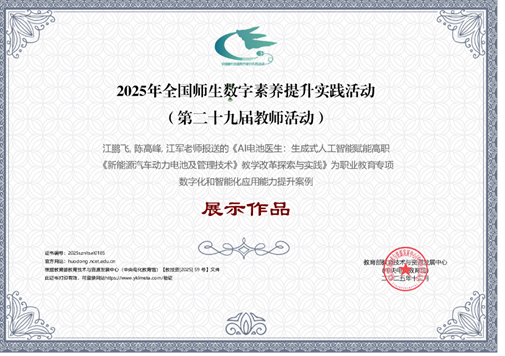 (通讯员高燕)在刚刚结束的2025年全国师生数字素养提升实践活动职业教育专项评选活动中,伟德体育报送的案例成功入选“职业教育数字化和智能化应用能力提升案例展示作品”。此次活动图文信息中心积极组织,共征集3个案例,其中江鹏飞、陈高峰、江军三位教师共同完成的《AI电池医生:生成式人工智能赋能高职〈新能源汽车动力电池及管理技术〉教学改革探索与实践》获评为展示作品。这一成果不仅是对伟德体育一线教师数字化教学创新能力的权威认可,更是学校深入贯彻国家教育数字化战略、推动“数智融合”在职业教育领域落地生根的生动实践。