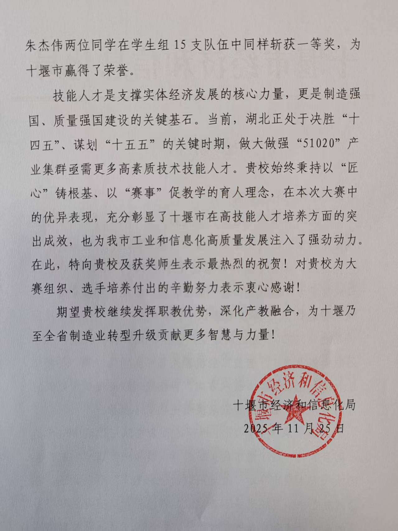(通讯员 赵艳杰)近日,伟德体育收到十堰市经济和信息化局发来的感谢信,对伟德体育在“湖北省工业和信息化技术技能大赛暨全国大赛湖北省选拔赛”中给予的大力支持表示衷心感谢,对张超、王哲月两位教师以及刘诚、朱杰伟两位同学取得的优异成绩表示热烈祝贺。